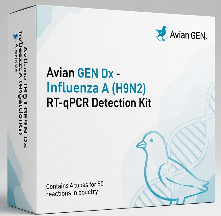 An RT-qPCR kit for the detection of avian influenza virus subtype H9N2 in poultry is a highly sensitive and specific molecular assay designed to detect H9N2 viral RNA in clinical samples such as oropharyngeal and cloacal swabs or tissues. The kit utilizes reverse transcription followed by real-time PCR amplification with H9N2 subtype–specific primers and probes, enabling rapid and accurate identification of the virus. It is intended for routine surveillance, early diagnosis, and outbreak investigation of H9N2 avian influenza in poultry populations.